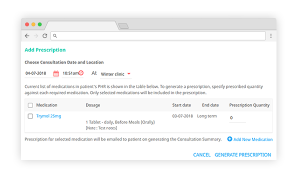Whether for clinic or online consultations, you can generate e-prescriptions through the Virtual Practice for your health services, in just a click.Add medication, dosage details, specific instructions about the treatment to generate a prescription.