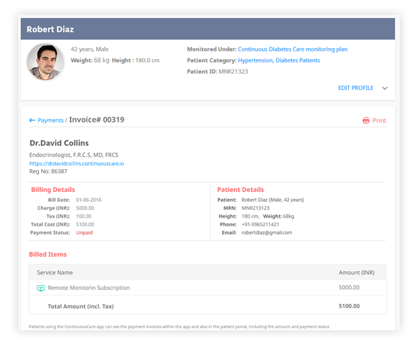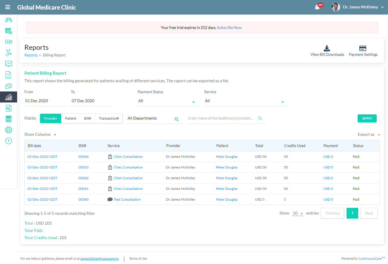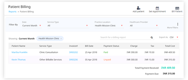 Access billing reports generated for patients availing various services such as video or clinic consultations, monitoring, etc. View, export & download billing reports to identify and gauge revenue generated in your practice.