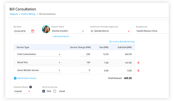 You can generate e-invoices and bills through the Virtual Practice for your health services, for clinic or online consultations. Select a service you want your charge patients for, generate a bill and share it with your patient who can pay for their consultation online.