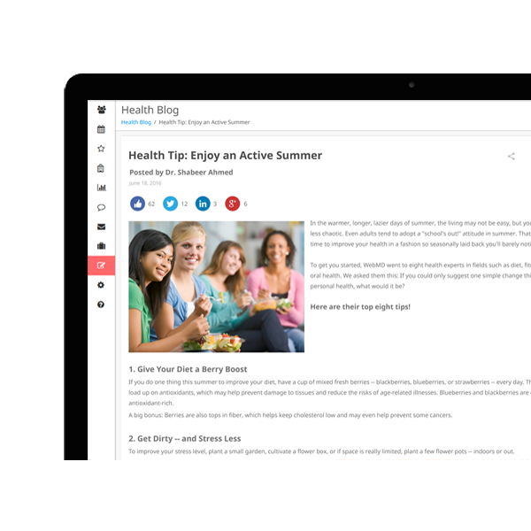 The Virtual Practice comes with a built-in Health Blog where you can publish your posts, sharethem to social media or notify your patients via SMS through the Notifications feature.