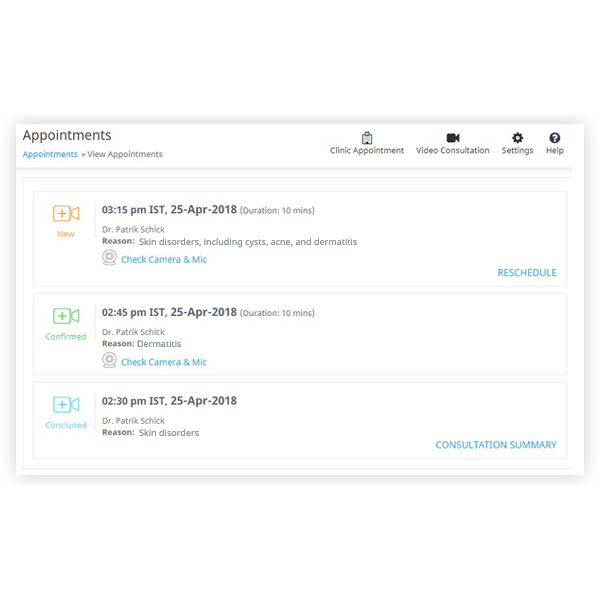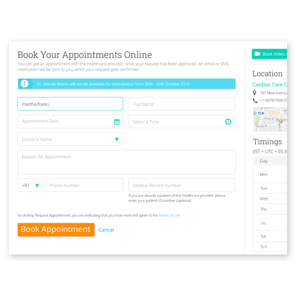 Your practice location and consultations timings will be visible to patients on your patient portal. Accordingly, they can book appointments with your practice for online or clinic consultations and view the status of their appointments by logging in to the patient portal.