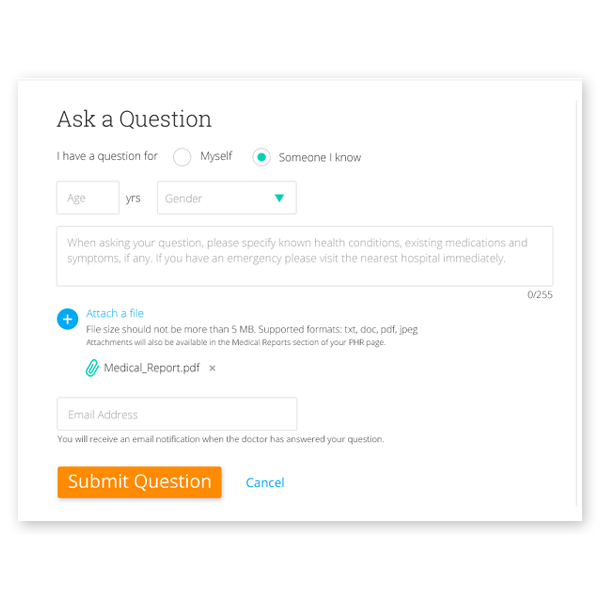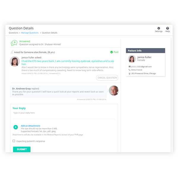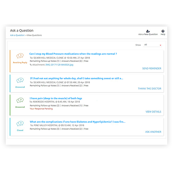 Your patients will be able to ask health-related questions through your patient portal. They can attach reports with their questions, ask follow-up queries and view your responses by logging in.