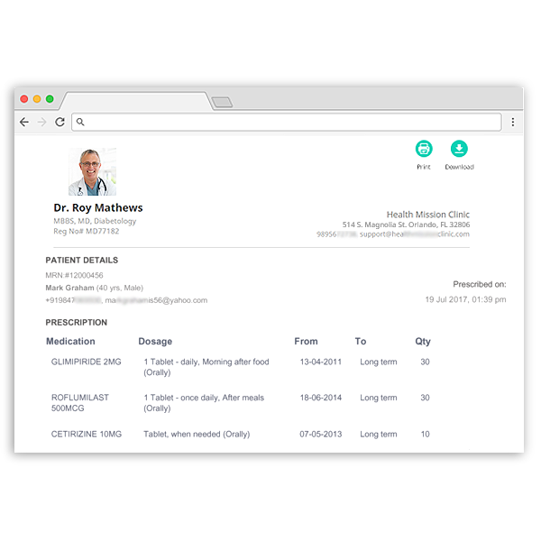 Once registered, your patients can visit the patient portal to access their health profile to update Personal Health Records (PHR), view prescriptions, medical reports and update details of their medical history.