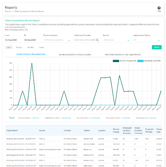 Evaluate usage of Video Consultations services in your practice, including appointments, actual encounters, cost and time details, through meticulously compiled service reports.