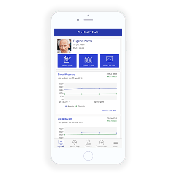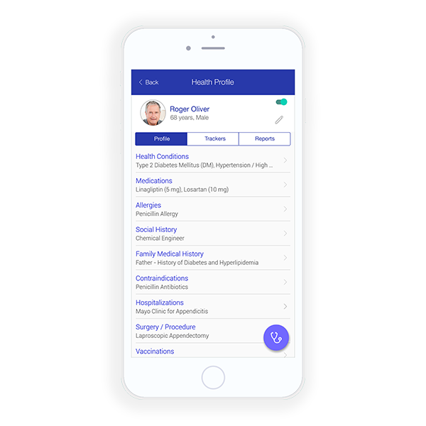The app comes with 49+ trackers allowing your patients to enter precise data which goes straight into their patient health record. The health trackers include - Blood ketone, Blood sugar, HbA1c, Exercise, Food, Creatinine, Urine glucose, Blood pressure etc...